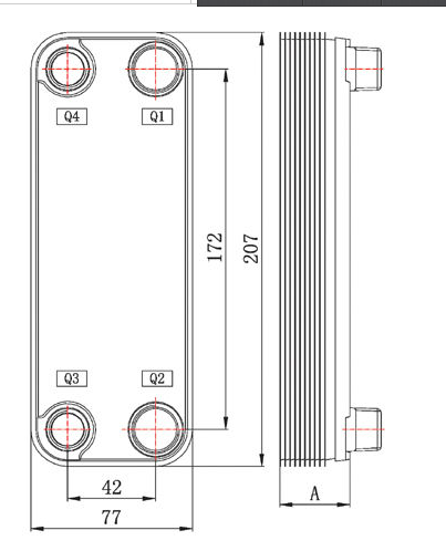 | Тип | Кол-во панелей | A(mm) | Вес(Kg) | Ёмкость канала стороны Q1Q2/стороныQ3Q4 | Площадь теплообмена (m2) |